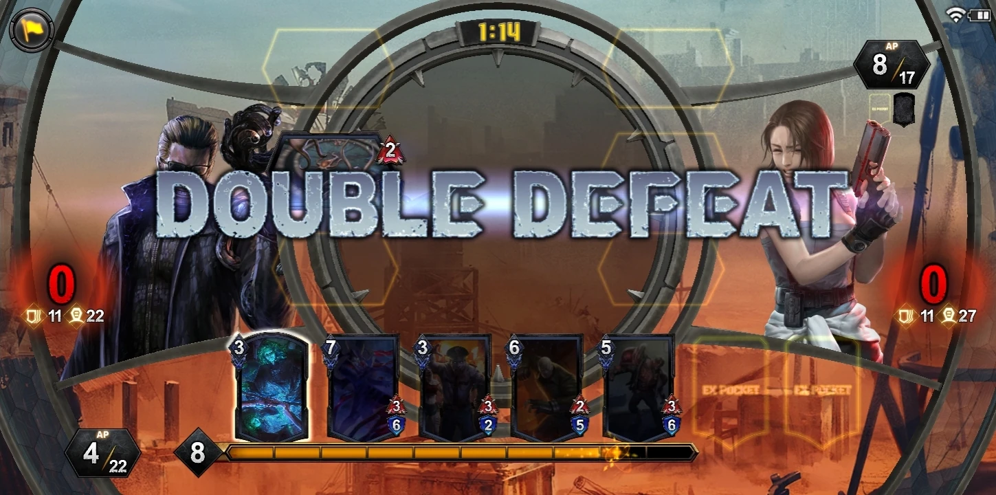 The matches in TEPPEN are in a 1v1 scenario, in order to win, the player must either get the opponent's Life to 0, have a higher amount of Life than their opponent when the match time runs out, or wait until the effect of Monstrous Virus (DON 075) ends on the opponent. Note that the opponent can only take effect of Monstrous Virus (DON 075) if they're using a purple Hero. There are no ties in the game, if both players have the same amount of Life when the match time reaches zero, or if the two players reach 0 Life at the same time, it will lead to a "DOUBLE DEFEAT" where both players lose.