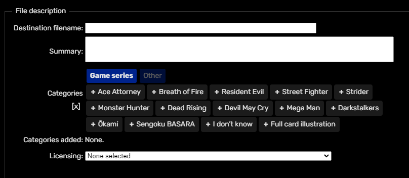 When uploading a card image, you may keep the original name of the file if it was obtained from the official TEPPEN site. By default, these files are named after the card's No. such as Morrigan013.png or Tda030.png, this works well when building a new card page.